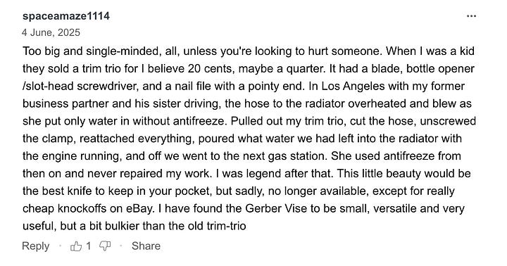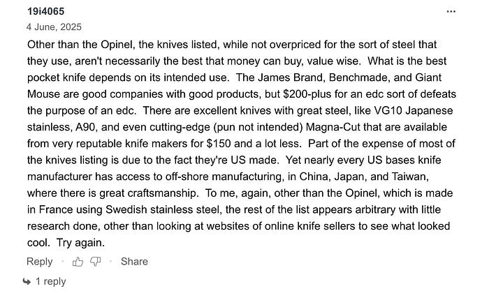 We could have fun psychoanalyzing them — the “I was legend [sic] after that” from the first and, in the second, the suggestion that US-manufactured knife companies all have access to offshore manufacturing that they’re refusing to utilize in a plot to drive up prices. Instead, let’s take their feelings seriously, like their parents clearly didn’t. In particular, spaceamaze1114's initial admonishment of “too big and single-minded” and 19i4065’s final curt directive to “Try again.”